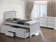 Showcase your personal taste with this bold statement piece in your bedroom. Fully upholstered in flannelette, this bed features an oversized wingback headboard with eye-catching tufting and lined with nailhead trim. The padded fabric and crystal buttons continue all throughout the bed frame and the matching case goods. Each drawer handle is made of glistening acrylic crystals, while silver-painted cabriole legs are perfect in bringing in majestic vibes that this ensemble set out to do.